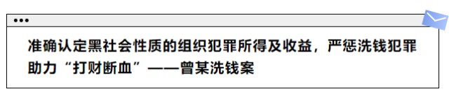 2018年11月28日,南昌市公安局以涉嫌组织、领导、参加黑社会性质组织罪等六个罪名将熊某等18人移送起诉。检察机关联同公安机关、人民银行反洗钱部门对本案所涉大额取现、频繁划转、使用关联人账户等情况进行追查、分析,查明曾某及其关联账户与熊某等黑社会性质组织成员的账户之间有大额频繁的异常资金转移。东湖区人民法院于2019年11月15日作出判决,认定曾某犯洗钱罪,判处有期徒刑三年六个月,并处罚金300万元。曾某未上诉,判决已生效。