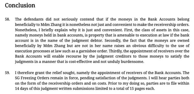 同时,新加坡高等法院同意了CVC旗下公司LDV对银行账户任命接管人的申请。这意味着,张兰的债权人将有权对该等资金进行追索。