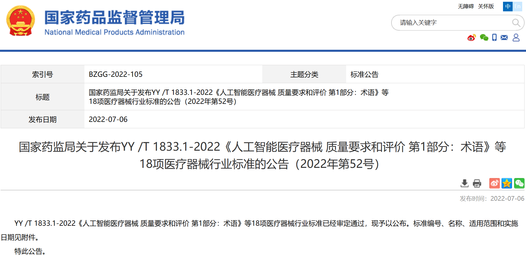 2022年3月,国家药监局器审中心发布的《人工智能医疗器械注册审查指导原则》重新描述了人工智能医疗器械的概念。
