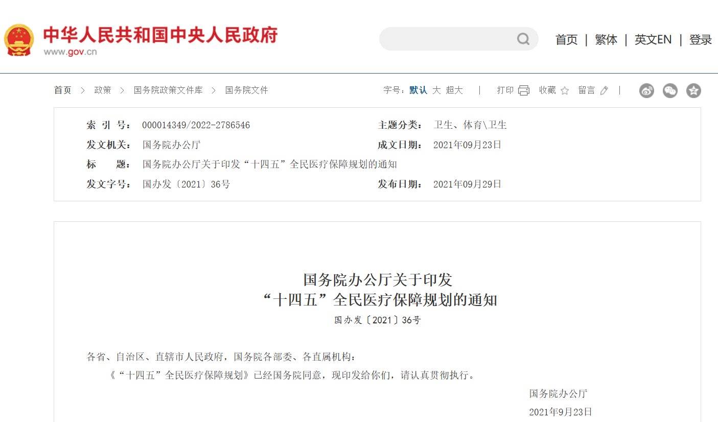 2021年9月,国务院办公厅印发《“十四五”全民医疗保障规划》,明确提出支持“互联网+医疗健康”等新模式蓬勃发展。