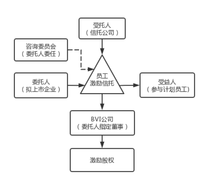 从以上结构图中可以清晰地看出,员工股权激励信托中的主体通常包含以下几方:信托的委托人是拟境外上市企业;受托人是信托公司,员工行权时,行权款支付给受托人,由受托人统一负责员工行权相关事宜;受益人是参与计划的员工。咨询委员会是一个类似于信托保护人的角色。