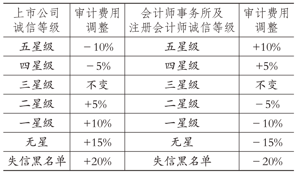 表6 中:①当年度审计收费以上一年度上市公司支付的审计费用为依据进行调整。②接受委托的会计师事务所及注册会计师诚信等级应一致。③上市公司诚信等级来源于表2,会计师事务所及注册会计师诚信等级来源于表4 及表5。④依据表2、表4、表5,当各被评定对象在年度内未受到任何部门任何形式的处罚时,其诚信等级评为三星级,因此审计费用以上年度为基数,按照不同的诚信等级考虑上下浮动5%进行调整。