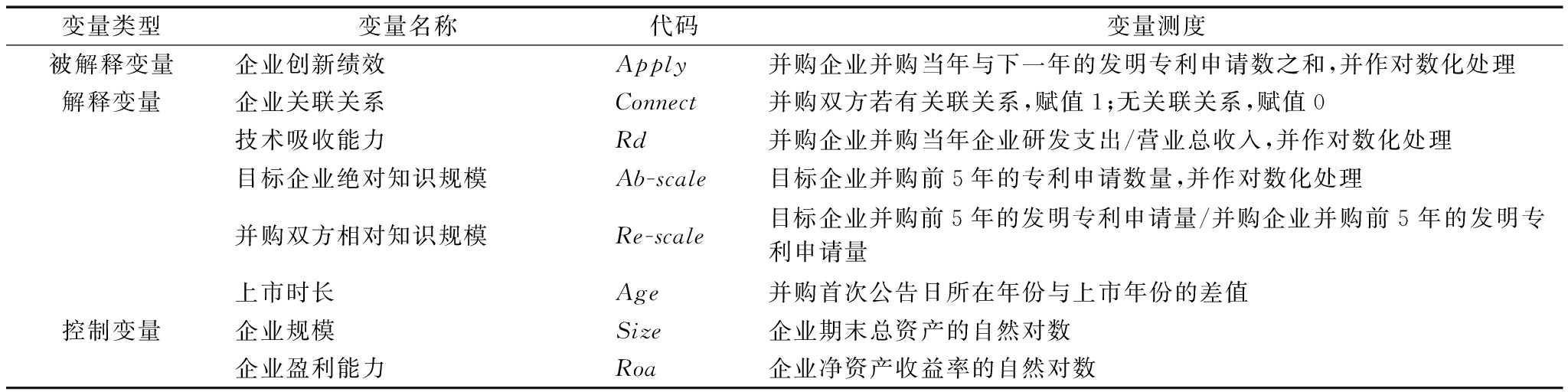(4)知识基础。知识基础包括目标企业绝对知识规模(Ab-scale)和并购双方相对知识规模(Re-scale)。温成玉和刘志新(2011)认为,技术知识基础是企业在技术方面的知识积累,采用专利数量作为衡量指标。因此,本文参考前人研究,设定目标企业技术知识绝对规模为目标企业并购前5年专利申请数量总和,并购双方技术知识相对规模为目标企业并购前5年发明专利申请量与并购企业并购前5年发明专利申请量的比值。
