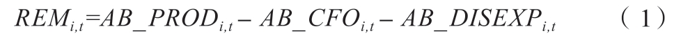 真实盈余管理。关于真实盈余管理指标的构建,本文参考 Bradertscher和Cohen等衡量真实盈余管理水平(REM)的方法,[27,28]通过下式计算得出: