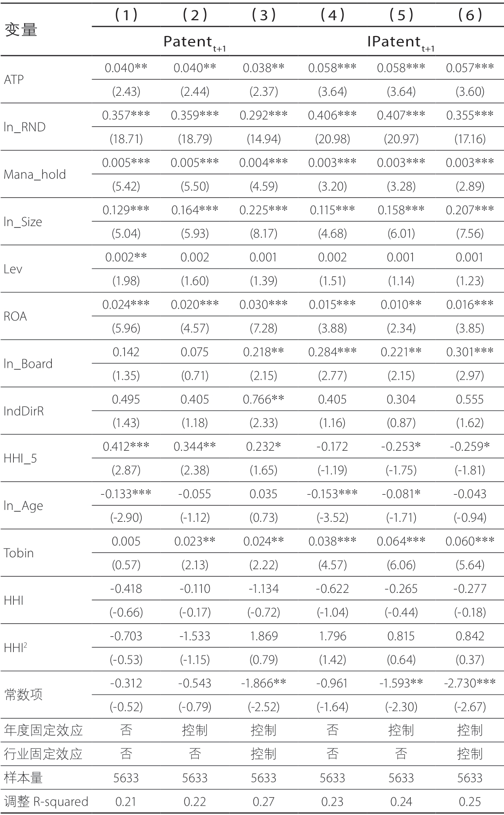 参考Chemmanur等,[6]在反收购条款与研发创新的研究中,本文选取的控制变量有:高管持股比例(Mana_hold)、企业规模(ln_Size)、资产负债率(Lev)、资产收益率(ROA)、董事会规模(ln_Board)、独立董事比例(IndDirR)、前五大股东持股集中度(HHI_5)、企业年龄(ln_Age)、所处行业赫芬达尔指数(HHI)及其平方项。