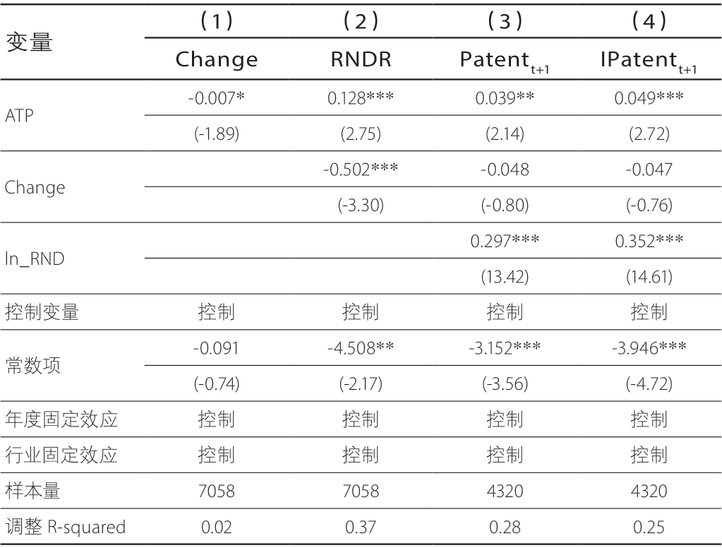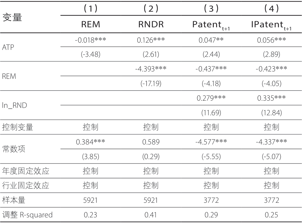 本文采用中介效应模型检验上述机制,主要分为两个步骤:一是检验反收购条款数(ATP)对中介变量(真实盈余管理水平REM或管理层更替Change)的影响;二是将中介变量和反收购条款数(ATP)一同纳入回归,研究其对企业创新的影响。