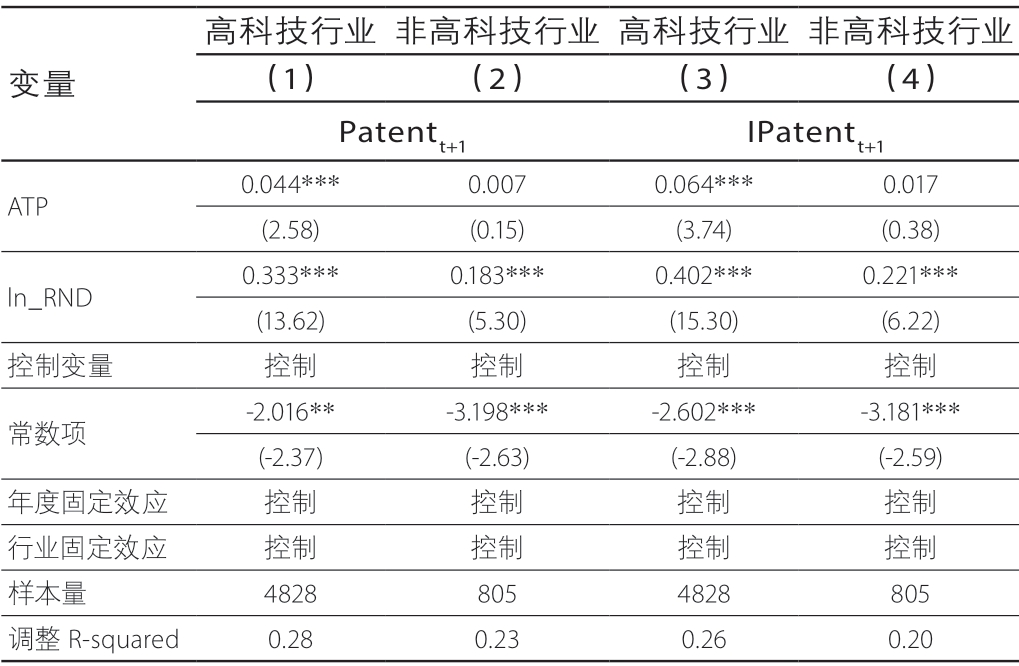 对于高科技行业而言,拥有可持续的技术创新能力是其在市场竞争中获得优势的关键。但由于创新投入具有一定程度的滞后性,在短期内无法体现,而且创新行为也具备较高的风险性,并非所有的投入都能有产出。如果大量的创新投入无法有效转化成对企业有价值的专利产出,高科技企业的价值将明显被低估,沦为敌意收购的目标。那么,在公司章程中设立反收购条款对企业自身进行保护对于处在高科技行业的企业将具有更大的价值。因此,本文参考潘越等及国内研究企业创新方面文献的度量方法,[26]根据中国证监会2012年颁布的《上市公司行业分类指引》中对行业分类的设定,按照上市公司所属的行业,把样本划分为高科技行业组和非高科技组。