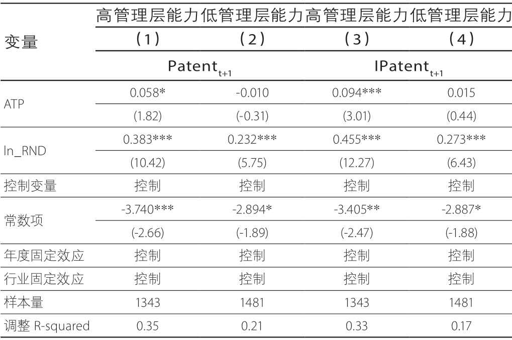 表9 反收购条款对企业创新促进作用在不同管理层能力企业间影响的差异