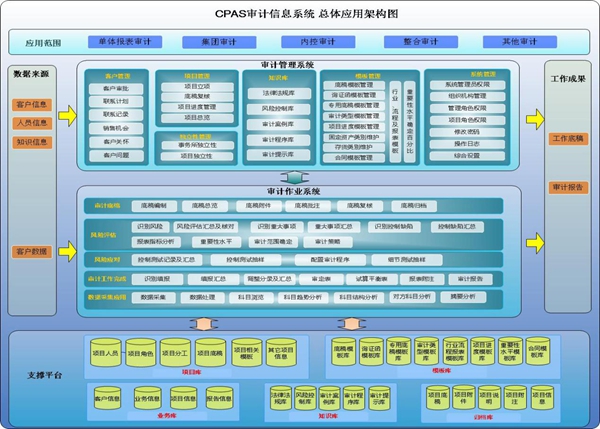CPAS审计信息系统项目建设的总体目标为:服务于国内会计师事务所,建立管理集中、覆盖全面、分工合作、反映及时的一体化审计信息系统。通过将执业准则与以风险为导向的审计理念固化进系统,提升注册会计师行业执业水平与执业质量。