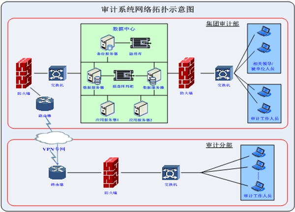 整个系统构架通过会计师事务所VPN接入,由2台服务器作为数据库服务器(采用SQL2008),2台PC服务器作为应用服务器(采用TOMCAT)。网络应用带宽要求20M以上,使用80端口进行访问,如图2。