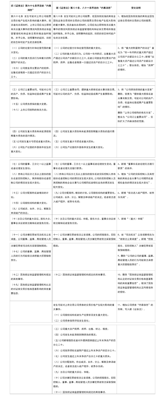 关于“内幕消息”规定的具体变化见下表: