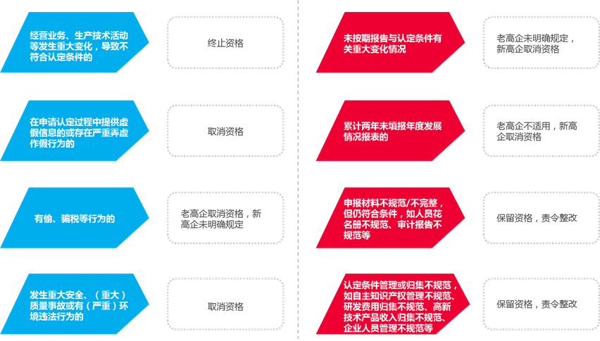 企业一旦踏进上述任何一个“雷区”,都可能直接导致其不满足高新技术企业相关认定条件并被视为“在申请认定过程中提供虚假信息”(老认定办法)或者“在申请认定过程中存在严重弄虚作假行为”(新认定办法),从而面临被取消高新技术企业资格的风险。