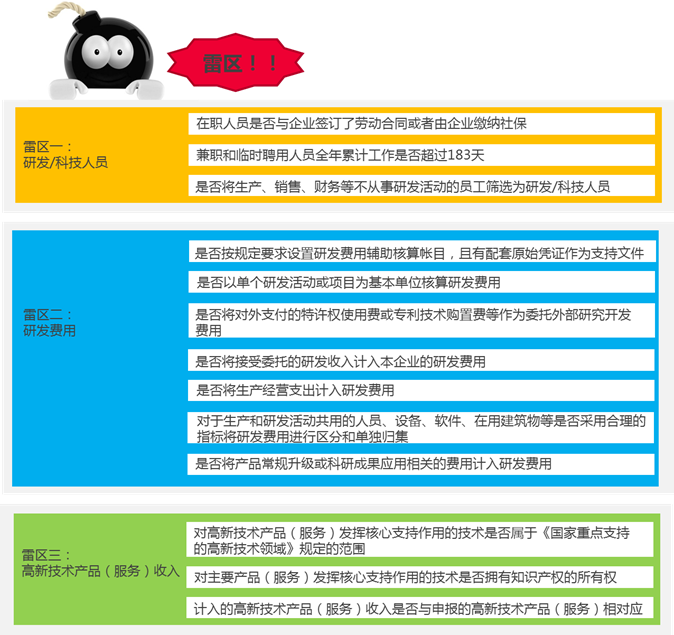 根据我们以往的项目经验,在企业日常合规工作或高新技术企业资格检查中,科技主管部门在与技术或知识产权相关的指标或要求方面更具有话语权;而对于税务机关,其更为关注的是研发/科技人员的筛选、研发费用的归集以及高新技术产品(服务)收入的统计。其中,研发费用的归集往往成为税企争议的焦点,也往往是产生涉税风险的重灾区。针对税务机关关注的这三方面问题,我们总结、整理了比较常见的“雷区”。