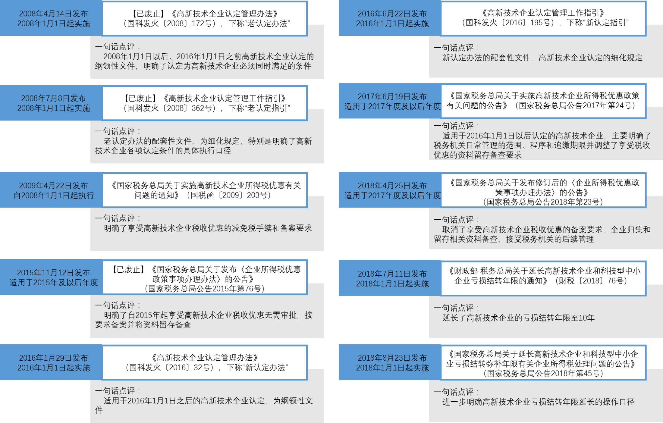 今年以来,国家出台了一系列的税收优惠政策,切实为企业做到减税降负。在这一背景下,税务机关在鼓励合规企业充分享受优惠政策的同时,也通常会加大力度检查并惩处不合规的企业,从而创造一个公平的税收环境,为国民经济的平稳发展夯实基础。通过本文,笔者根据多年的相关从业经验,对高新技术企业税收优惠政策的演变以及企业可能面临的问题进行了总结,供大家借鉴。