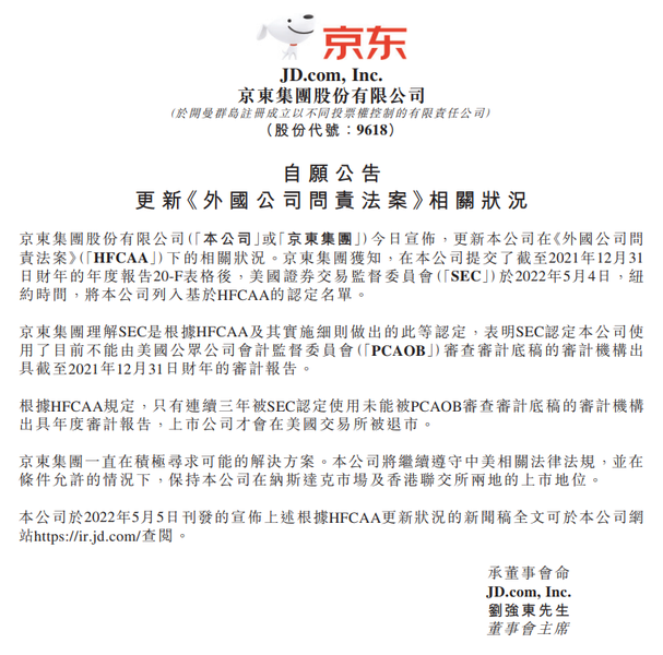 京东就被列入“预摘牌名单”一事回应称,公司一直在积极探索可能的解决方案;公司将继续遵守中美相关法律法规,并在条件允许的情况下,保持公司在纳斯达克市场和香港联交所两地的上市地位。
