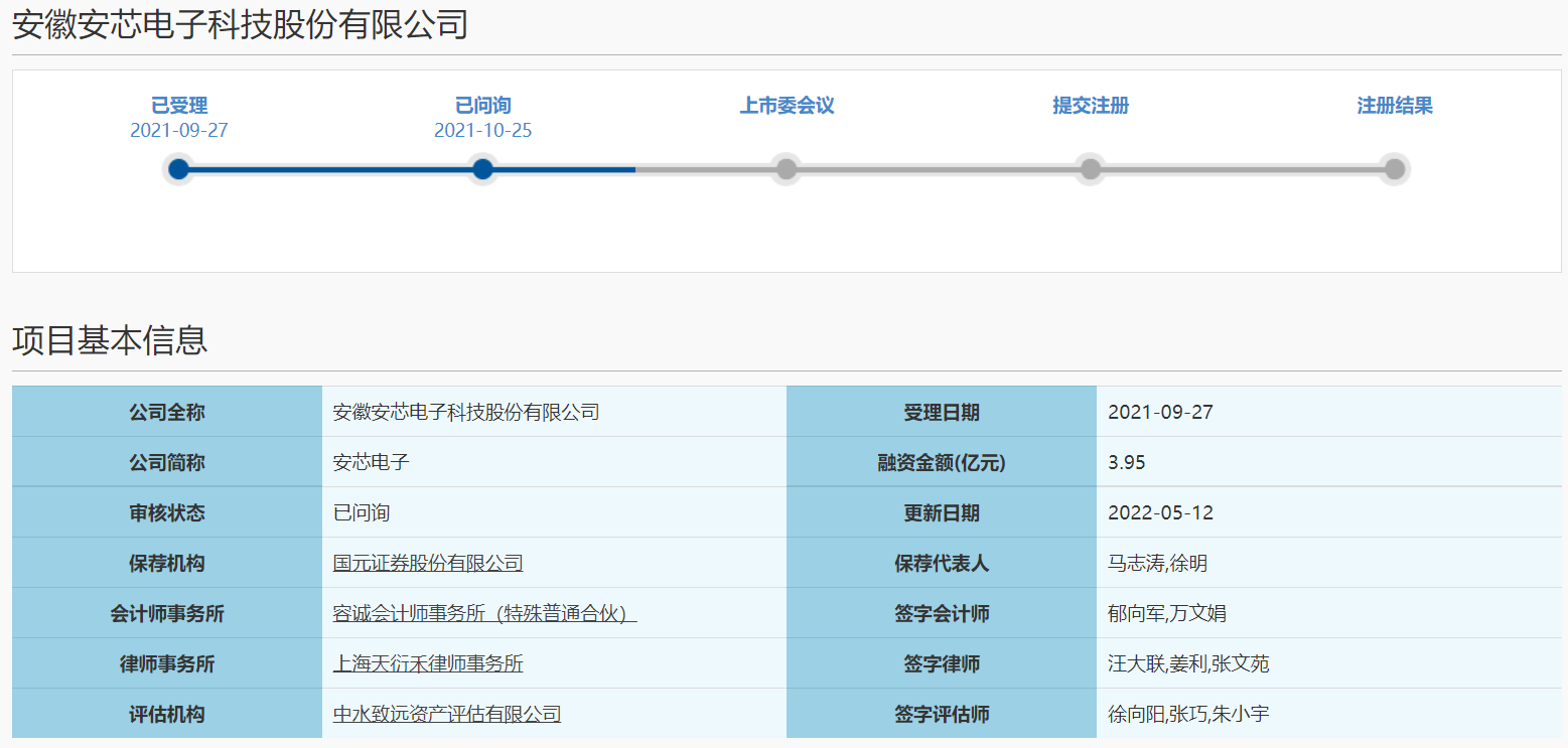 安徽安芯电子科技股份有限公司(下称“安芯电子”)科创板IPO恢复审核。