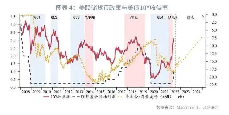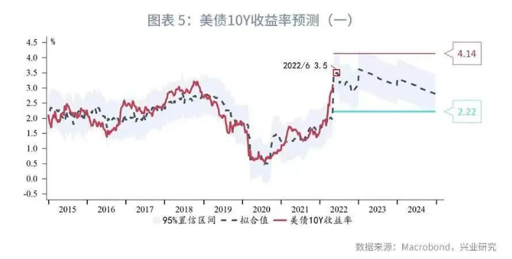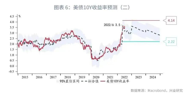 基于上述缩表假设,并以美联储3月FOMC点阵图中枢上限(Central Tendency High)为预设加息路径,构建对于美国国债10Y收益率的回归模型。该模型R2达到了0.7587,具有非常强的解释力度。模型指示的年内10Y收益率高点出现在6月,拟合中值为3.55%,95%置信区间上限高达4.14%。下半年收益率将边际回落,但拟合中值仍在3%以上,95%置信区间下限2.22%。在美联储持续加息和缩表并行的前提下,未来两年利率中枢维持高位。