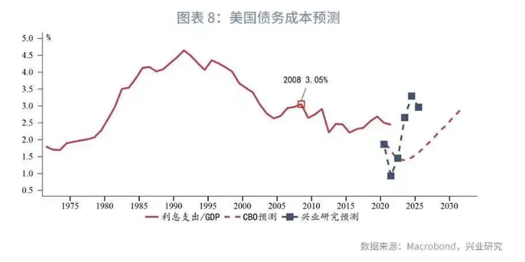 准备金相对水平的另一个替代性指标为“准备金余额/名义GDP”,选用CBO的GDP预测,以上述方法同样构建模型,获得的结论基本一致:2022年美债10Y收益率高点出现在6月,拟合中值3.9%,95%置信区间高达4.77%,下半年边际回落,拟合中值同样保持在3%以上,95%置信区间下限 2.48%。在美联储持续加息和缩表并行的前提下,未来两年利率中枢维持高位。
