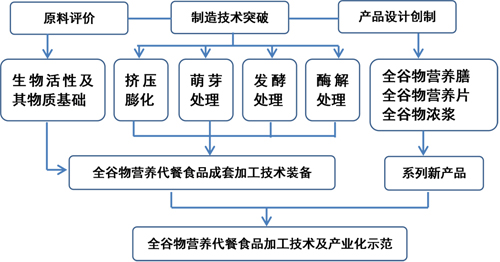 系统评价了糙米等全谷物资源中活性物质含量、化学组成及存在形式,发现并确证了酚类物质在全谷物糙米改善糖脂代谢中的贡献,提出了除维生素、谷维素等成分外,多酚是全谷物发挥健康功效的重要活性成分;建立促进促进全谷物结合态酚类物质释放,并提高其酚类物质生物可及性的全谷物加工技术;针对全谷物淀粉糊化不完全、冲调分散性差,全谷物浓浆淀粉老化返生等问题,研发了全谷物内外源酶解耦合挤压膨化、全谷物片多轮辊压成型和多糖蛋白复合抗淀粉老化返生技术,研制出糊粉类、片类、乳类和谷物浓浆类全谷物营养代餐食品加工关键技术装备和产品,并实现了产业化生产示范。相关研究获2013年中华农业科技奖一等奖和2014年广东省科学技术一等奖。