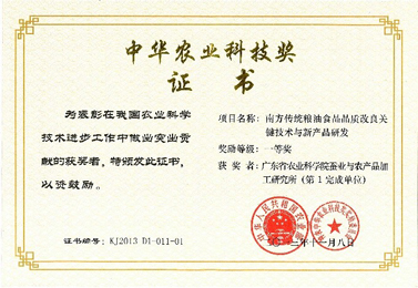 5. | 南方传统粮油食品品质改良关键技术与新产品研发 | 中华农业科技一等奖 | 2013 |