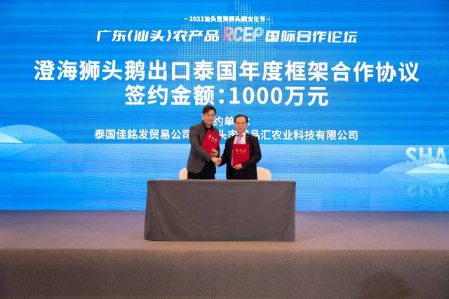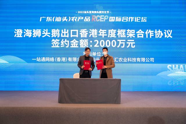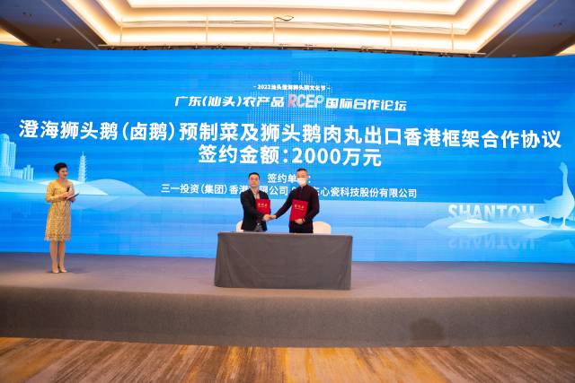 论坛还进行了汕头市预制菜出口合作签约仪式。三一投资(集团)香港有限公司与广东心瓷科技股份有限公司,一站通网络(香港)有限公司、泰国佳銘发贸易公司与汕头市鹅品汇农业科技有限公司分别签署了合作协议,累计签约金额达5000万元,将共同推动澄海狮头鹅预制菜产品持续销往中国香港、泰国。