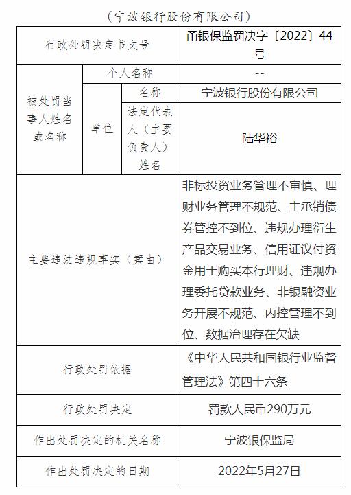 依据《中华人民共和国银行业监督管理法》第四十六条,宁波银保监局对宁波银行罚款290万元。