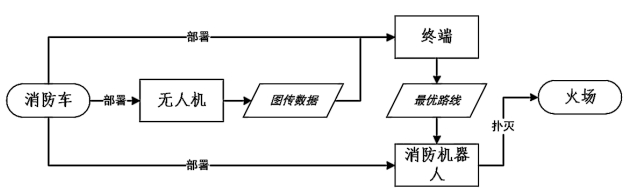本文基于一种无人机与智能消防机器人协同侦察灭火的应用展开论述。通过无人机装置传感器,对火势变化进行实时远程监测,利用5G网络将数据传至终端,最后进行一系列算法分析得出最优扑灭路线,全程无须人员操作,降低了消防人员的工作难度,最大程度上保障了消防人员的人身安全。