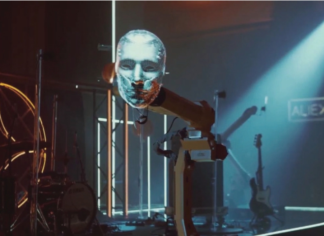 以时装秀,很多人都认为时装秀就是超模的展示服装的过程中。在2020 年10 月2 日,南京达斯琪数字科技有限公司的俄罗斯品牌Holo One,打破传统模式,将“赛博朋克”这一极具未来科技感和虚拟现实主义的理念,运用到时装秀场上。团队与AliExpress 合作在莫斯科世界贸易中心皇冠假日酒店举办了AliExpress 的首个海外时装秀团队。从整体空间出发通过分布式的点位设置和多样化的展示形式奠定整体布局。多台带有立式支架的DSee-65X,穿插在立麦、键盘、架子鼓之间全息影像替代乐队的主唱与鼓手打造一场虚幻世界的摇滚乐表演。在这一场时尚艺术展示的过程中,团队还首次尝试将全息屏设备搭载于工业机器人上具有裸眼3D 效果的机器人的脸部骨骼模型被呈现在人们眼前,机器臂配合着全息动画缓缓运转,如图1。此次时装秀T 台由多个DSeeWall 组成搭配激光射线、霓虹灯管等大量照明设备实现时装模特与“全息模特”同台给观众制造亦虚亦实的奇幻景象团队试图通过打造一个“赛博空间”,表达出对未来社会与科技高速发展的独特见解。这一艺术活动中,将科学技术与实际生活联系在一起,充分展示出艺术家对未来社会的见解,为数字媒体艺术发展做好铺垫。