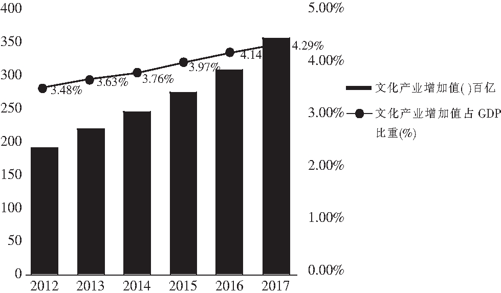 图1 2012-2017年中国文化产业增加值及占GDP比例