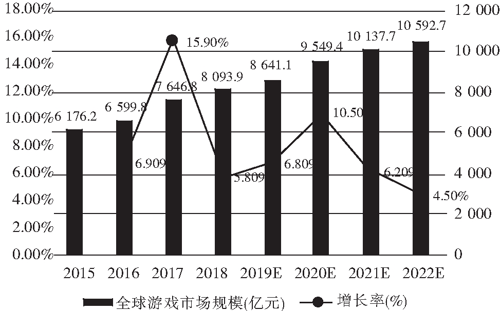 随着经济的快速发展与人民对美好生活的向往,国民对文化的消费能力逐渐增强,文化产业占国内生产总值比例也越来越高[1](如图1所示)。其中游戏产业数值更是一路飙升,截至2018年末,全球的游戏市场总体规模达到了8 093.9亿的人民币,据中国产业信息网预测,往后几年全球游戏市场规模还会继续扩大,但增速减缓[2](如图2所示)。