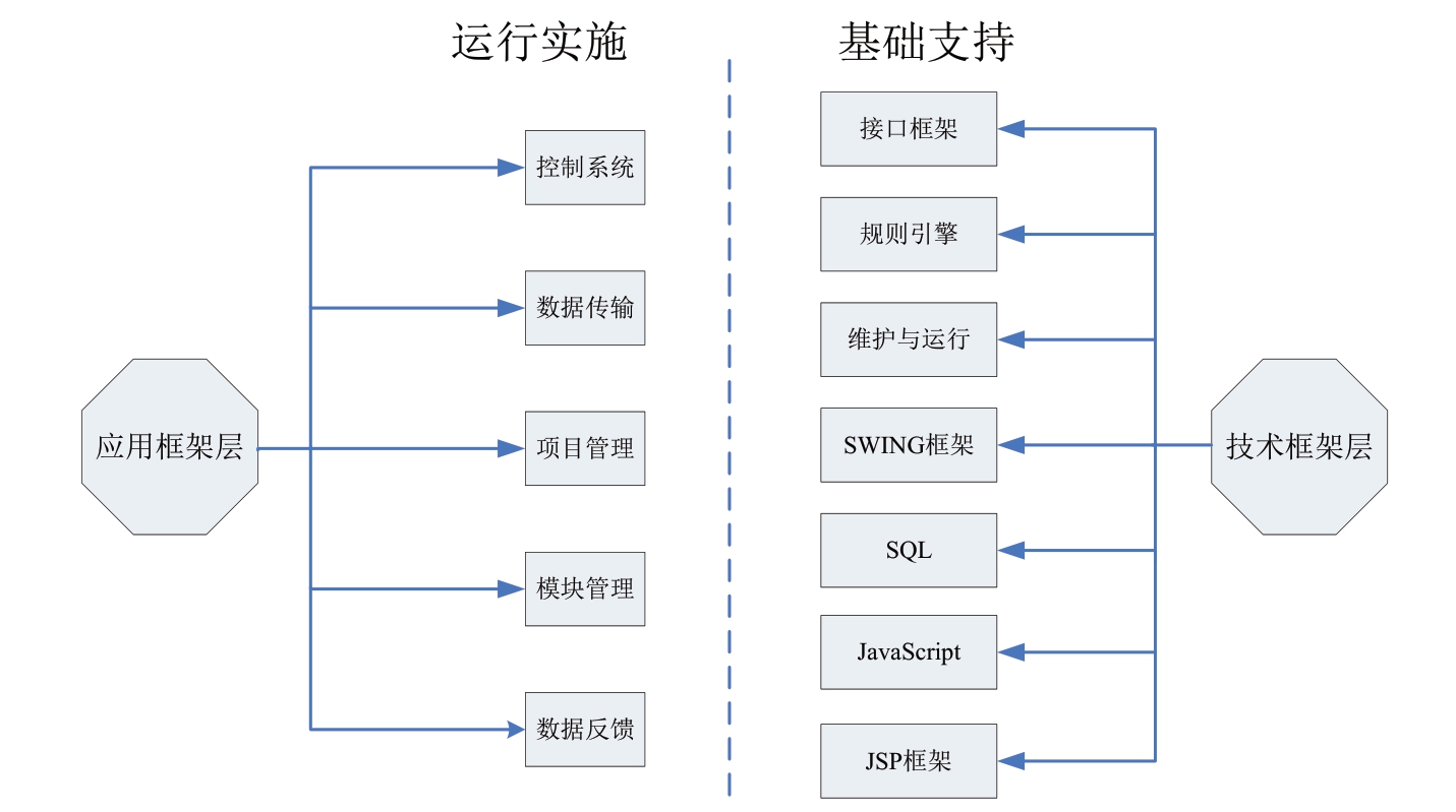 系统的各个管理模块是由技术框架提供基础,应用框架层实施的,应用框架层和技术框架层的架构图如图2所示。