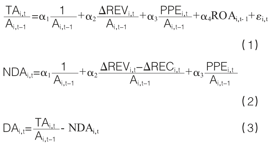 上述公式中TAi,t 指总应计利润,为净利润减去经营活动现金流量净额之差,Ai,t-1 为总资产,PPEi,t 为固定资产原值,ΔREVi,t 为当期与上期的主营业务收入变化量,ROAi,t-1为总资产报酬率,ΔRECi,t 为当期与上期的应收账款变化量。公式(2)中α1、α2、α3 是对公式(1)进行回归得到的回归系数,将公式(1)计算出的结果减去公式(2)可以得到操控性应计利润,εi,t 为残差。