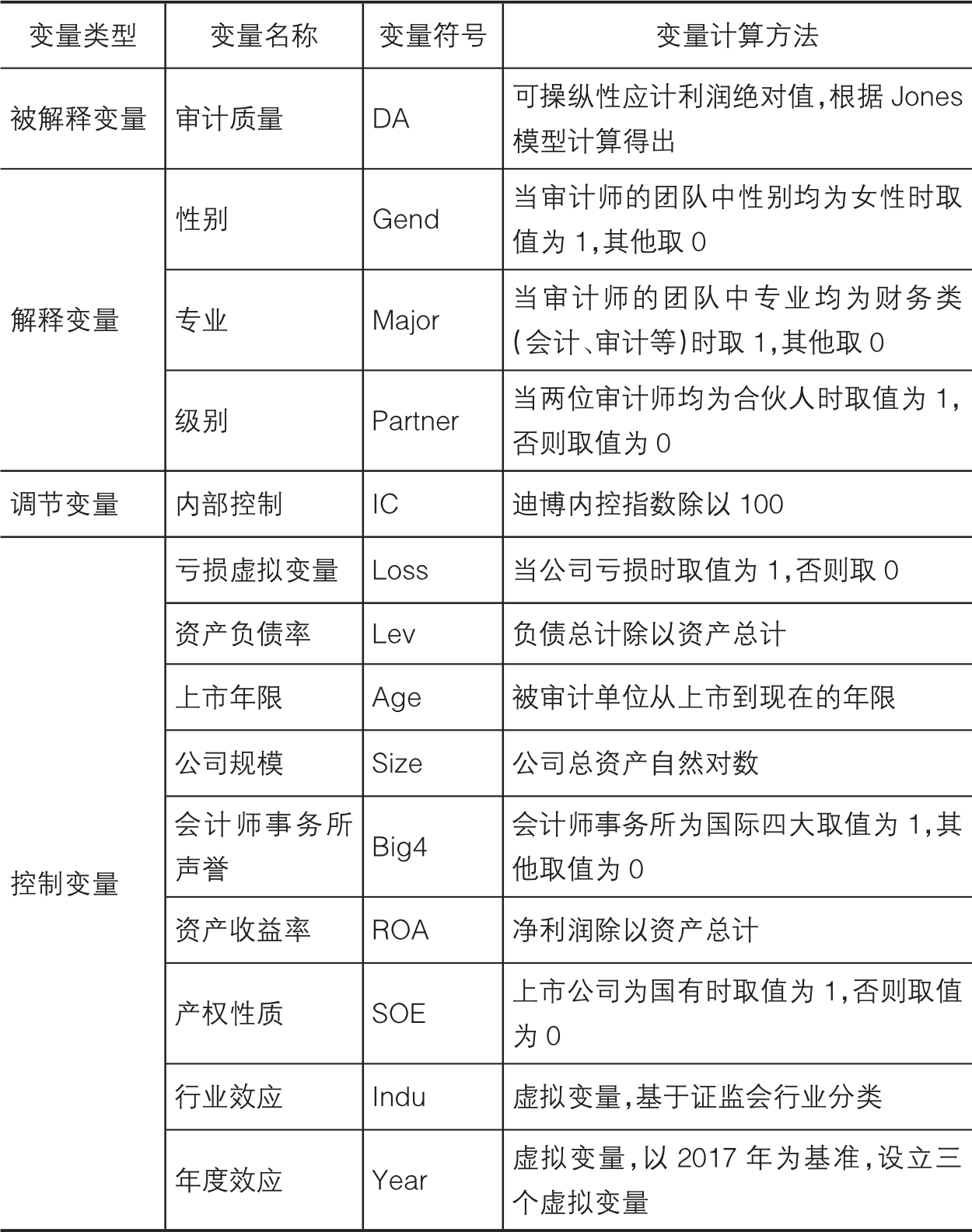 (1)性别。本文对数据做了如下定义,即当审计师的团队中性别均为女性时取值为1,否则取0。