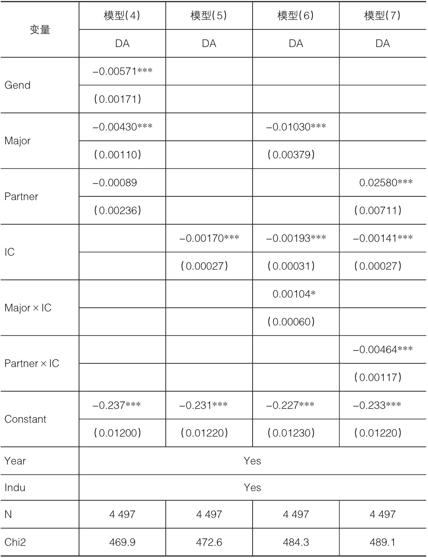 从表4 第4 列可以看出Major×IC 对DA 的系数在10%的水平上显著为正,回归结果证明了H5,即内部控制水平越高的企业,财会类签字审计师对审计质量的边际贡献越小。这是因为上市公司内部控制质量越好,其出具的财务报告可靠性越高,这会降低重大错报、漏报发生的概率。在这种内部控制水平较高情况下,审计师出具无保留意见的审计报告概率偏大,因此不管是财会类还是非财会类审计师,对审计质量影响都较小。