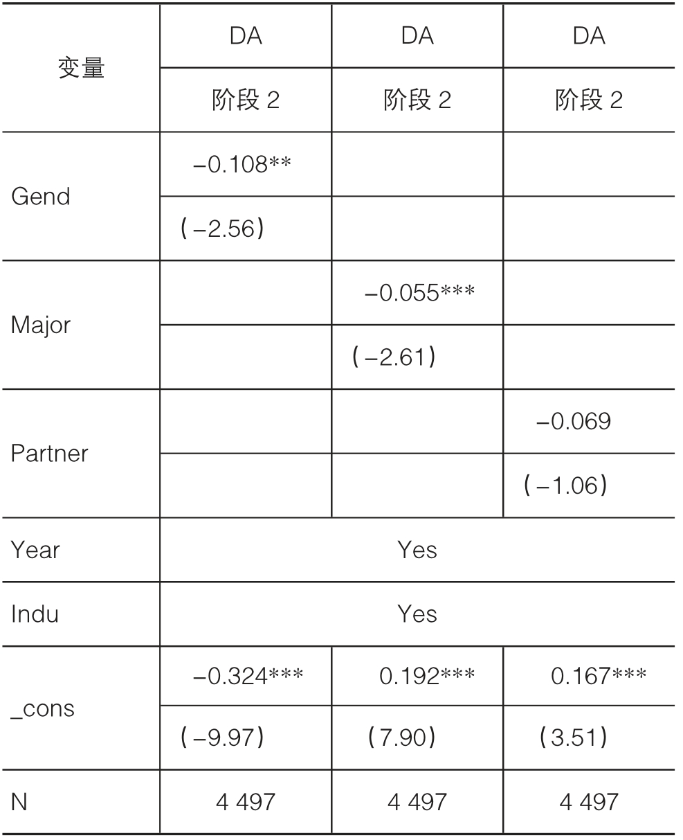 为了使研究结果更具稳健性,本文借鉴张凤丽和陈娇娇[5]的观点,采用加入控制变量的方法进行稳健性检验。选取签字审计师的任期(Tenu,以资格取得时间衡量,取两位审计师资格取得时间最大值为该组合最终取值)、学历(Degree,当审计师学历为硕士及以上时取1,其他取0)、政治面貌(Ccp,当两位审计师中有一人为党员时取值为1,否则取值为0)。将上述变量代入模型中回归,回归结果如表5 所示,与假设一致,说明研究结论是稳健的。同时,考虑到审计质量更易受具有某种特质审计师影响这一内生性问题,为了使研究结果更具稳健性,本文借鉴张川等[23]的观点,选取工具变量法估计签字审计师背景特征对审计质量的影响。结合工具变量法的计量知识,本文选择签字审计师背景特征的行业平均值(Pj_Gend、Pj_Major、Pj_Partner)作为签字审计师背景特征Gend、Major、Partner 的工具变量,结合本文构建的模型和变量特征,采用2SLS 两阶段法对结果进行验证,回归结果如表6 所示。由表6 可知,在控制内生性之后,签字审计师背景特征对审计质量的影响与原文假设基本一致,说明本文的研究结论是稳健的。限于篇幅,上述分析只列示部分回归结果。
