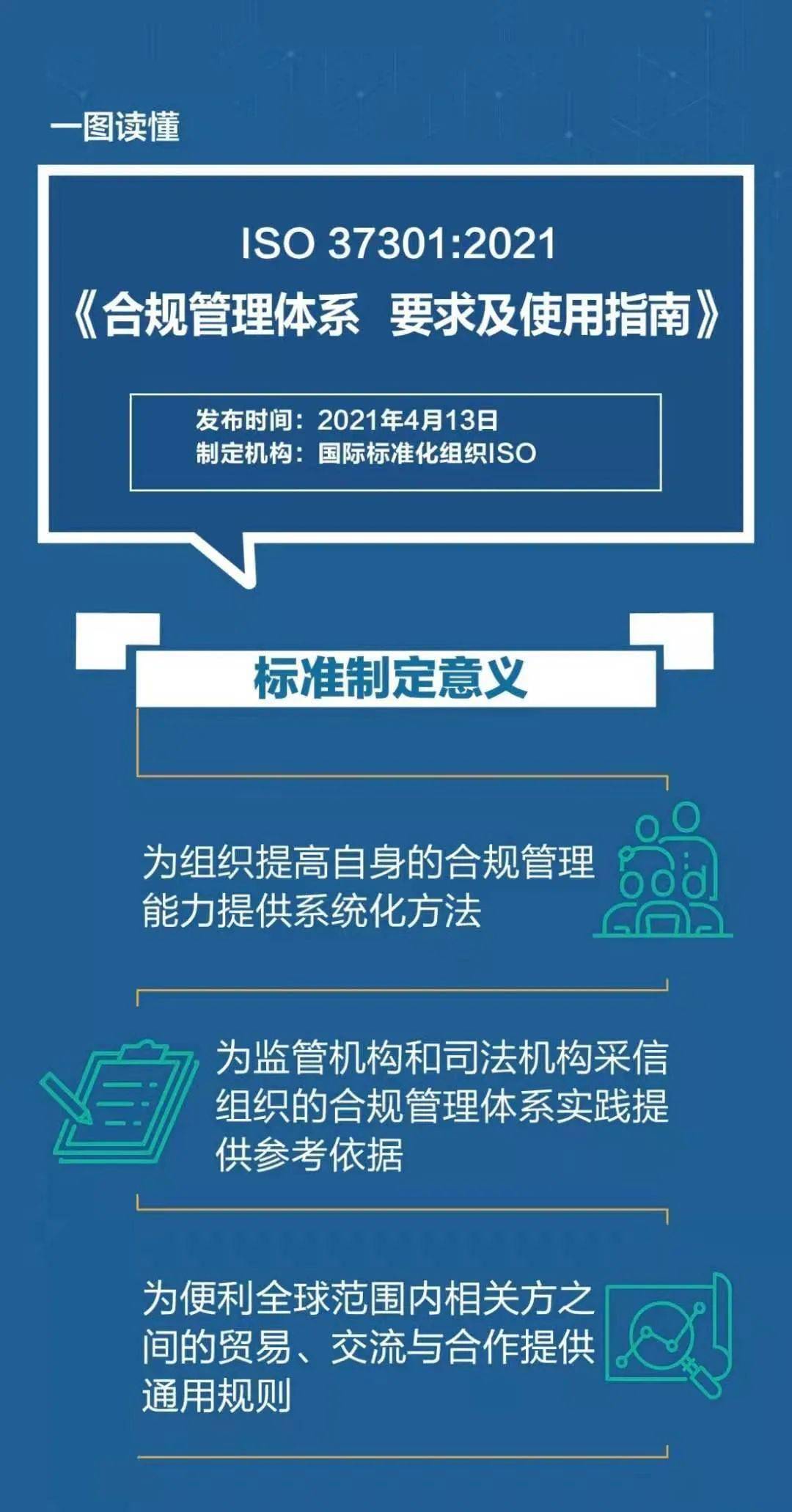 2021年4月13日,ISO 37301: 2021《合规管理体系 要求及使用指南》(Compliance management systems — Requirements with guidance for use)国际标准正式发布实施。