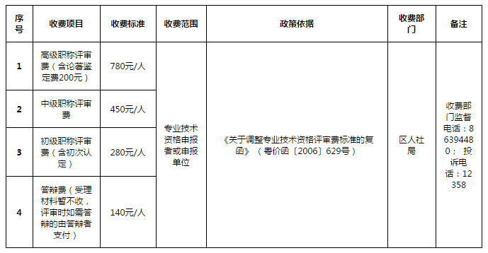 专业技术资格评审费收费标准(区人社局)