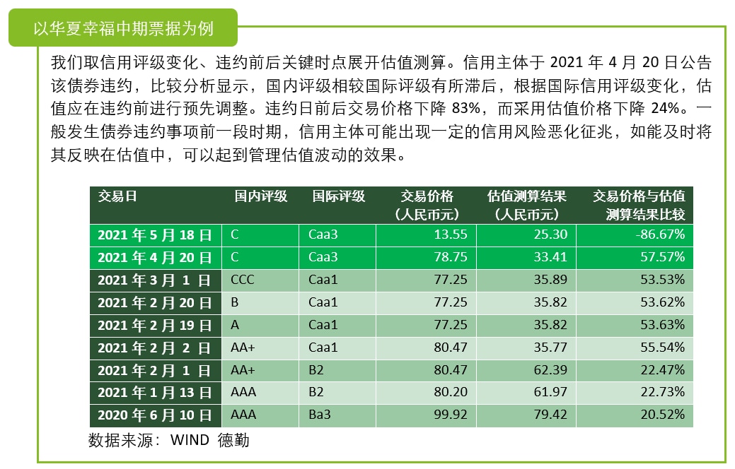 基于违约债券市场的公开交易价格,当交易较活跃时,通常在价值层级中处于较高层级,容易获取;而可靠的第三方估值(如中债或中证估值),也是市场参与者普遍认同,并符合监管估值指引的做法;