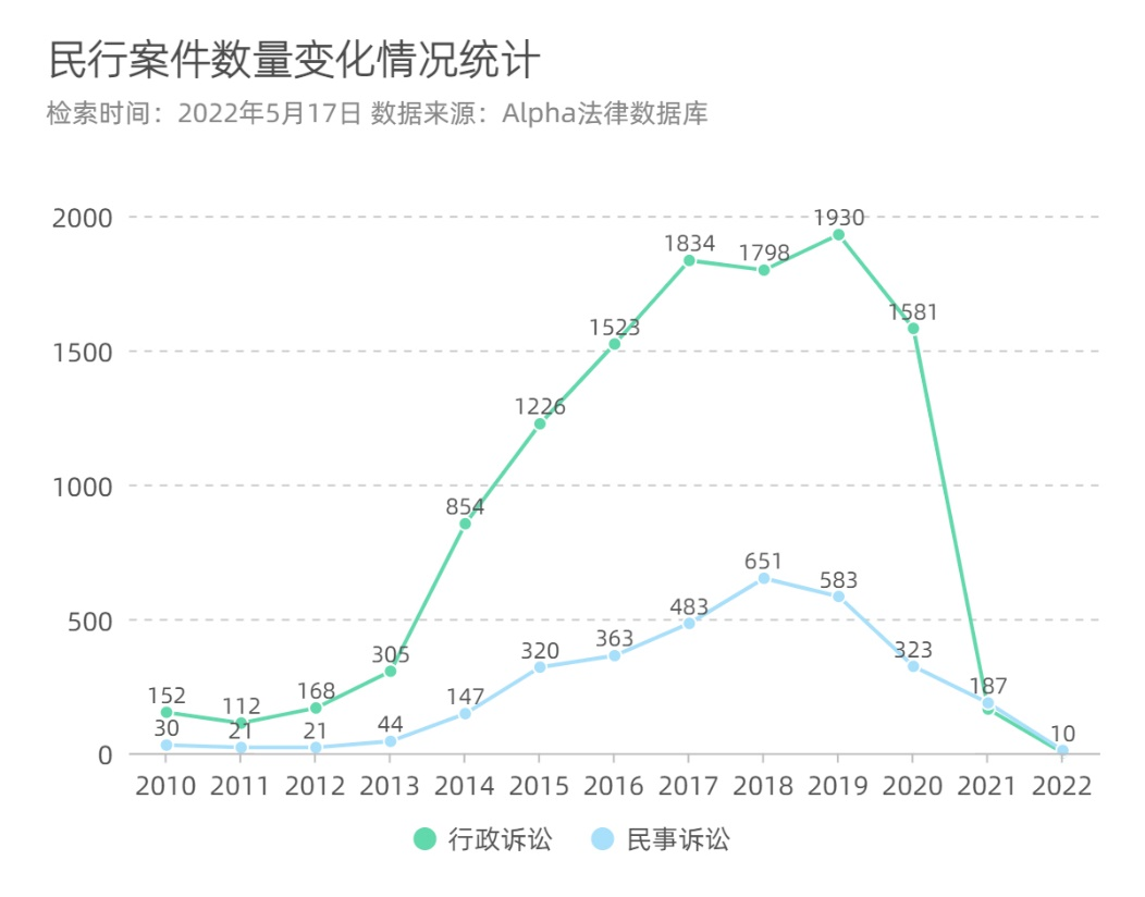 2015年5月1日施行的《行政诉讼法》首次明确了行政协议案件属于行政诉讼受案范围,随后施行的《最高人民法院关于适用〈中华人民共和国行政诉讼法〉若干问题的解释》(下文简称《行政诉讼法司法解释》)又对行政协议的定义、特征、类型等做了进一步规定。这两部法律文件无疑给认为土地使用权出让合同纠纷案件属于行政案件的司法观点提供了助力,从案件数量的变化上可以看出,涉土地使用权出让合同的行政案件此后几年一直保持增长态势。