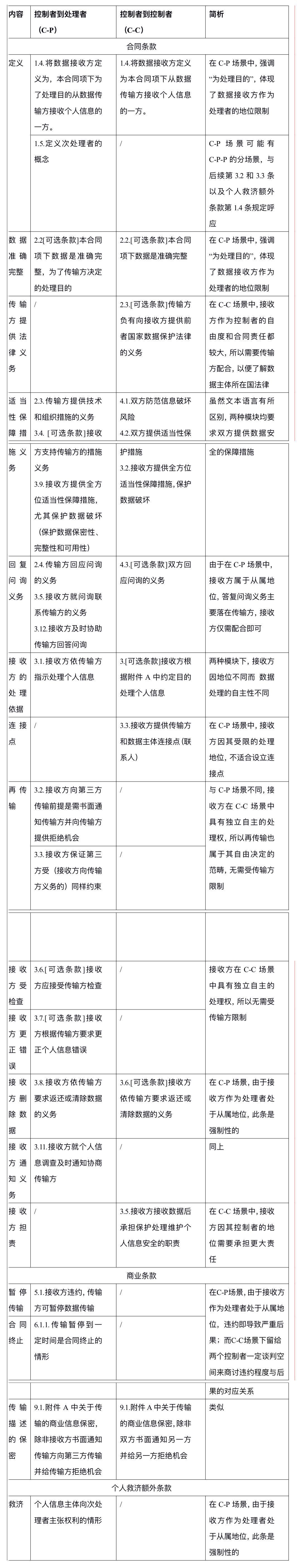 东盟MCC采用两大模块设计合同条款,对应如下两个传输场景:从控制者到处理者(C-P)和从控制者到控制者(C-C),但缺少欧盟SCC的另外两类场景的模块:从处理者到处理者(P-P)和从处理者到控制者(P-C)。对此,东盟MCC解释到,现有的两大模块是实践中常见的业务场景。