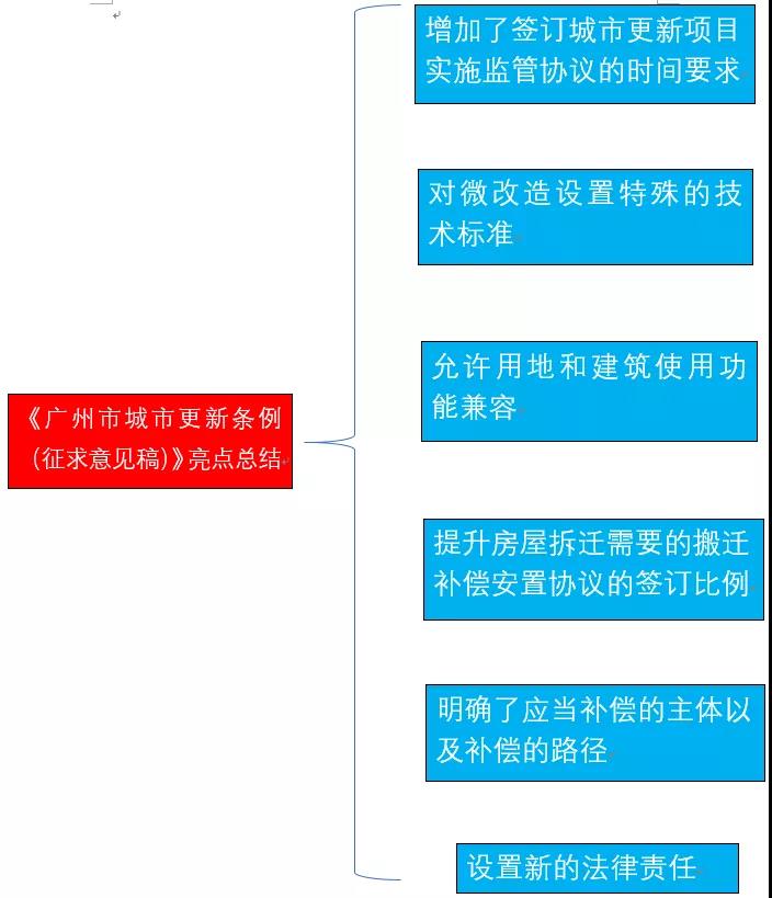 本文总结的《广州市城市更新条例(征求意见稿)》之剩余的六个亮点总结如下图: