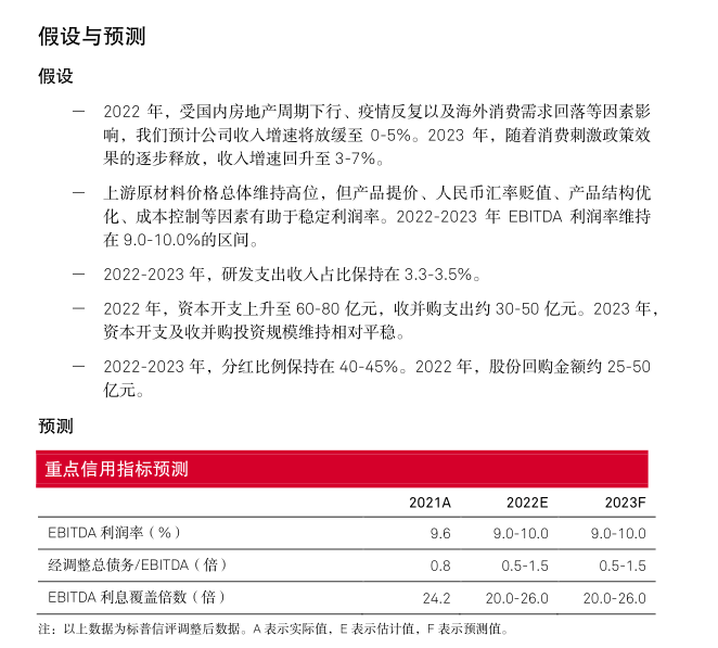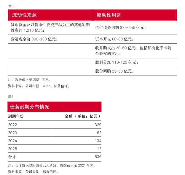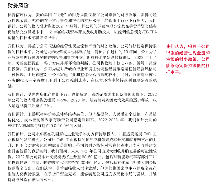 标普信评认为,美的集团的流动性状况为“极强”,未来 12-24 个月,流动性来源对于流动性需求的覆盖倍数超过 2.4 倍。未来 12 个月,公司的流动性来源主要为货币资金以及其他短期投资(以货币性投资产品为主)、营运现金流入,流动性需求主要为偿付到期债务、资本开支、分红、股份回购等。我们预计,公司将维持 40-45%的分红比例,同时根据股权激励计划和资本市场表现动态调整股份回购计划。美的集团在银行金融机构拥有充足的授信储备,能够满足公司对流动性调配的需求。截至 2021 年末,公司共计获得银行授信 1,297 亿元,剩余可用授信额度 664 亿元。