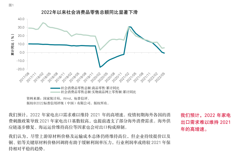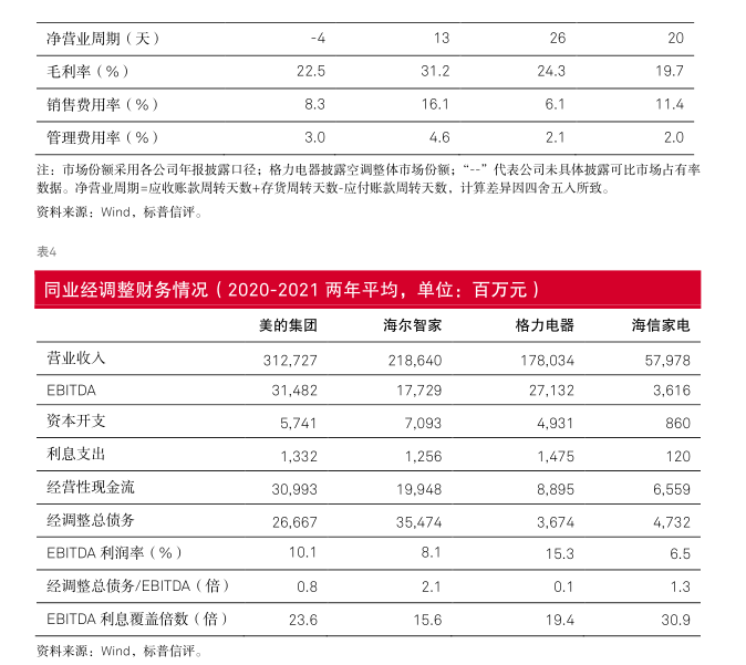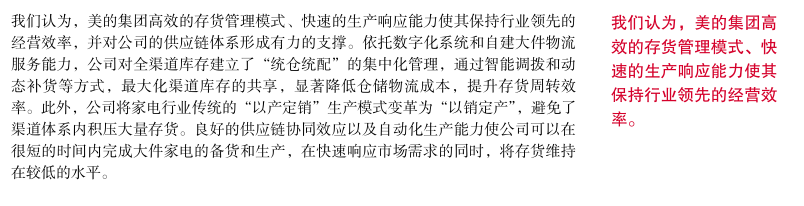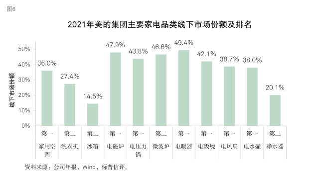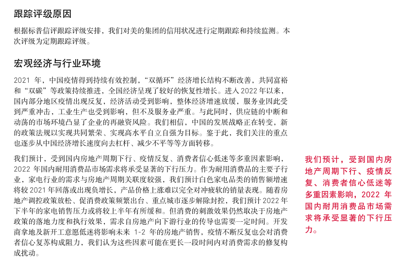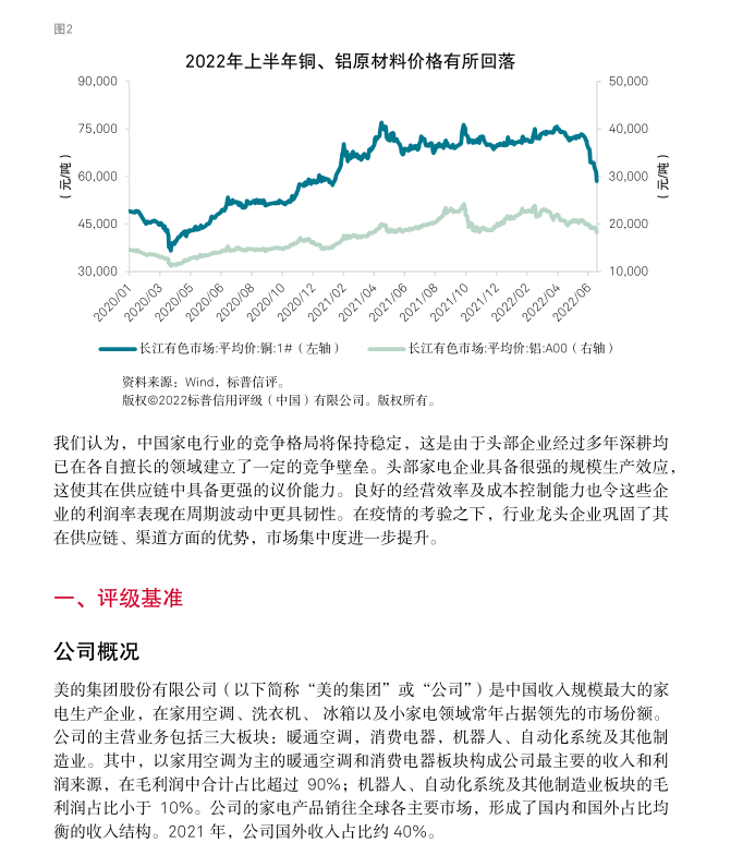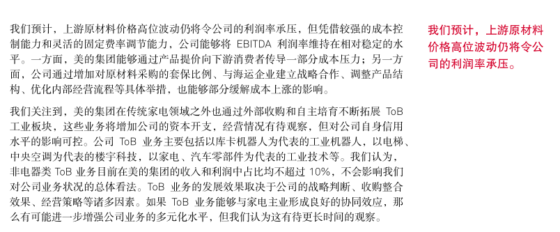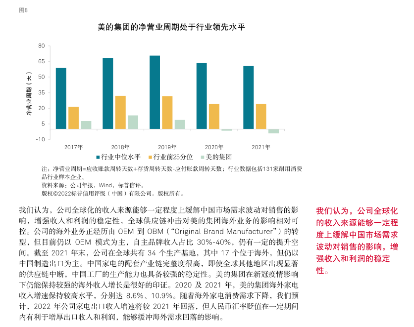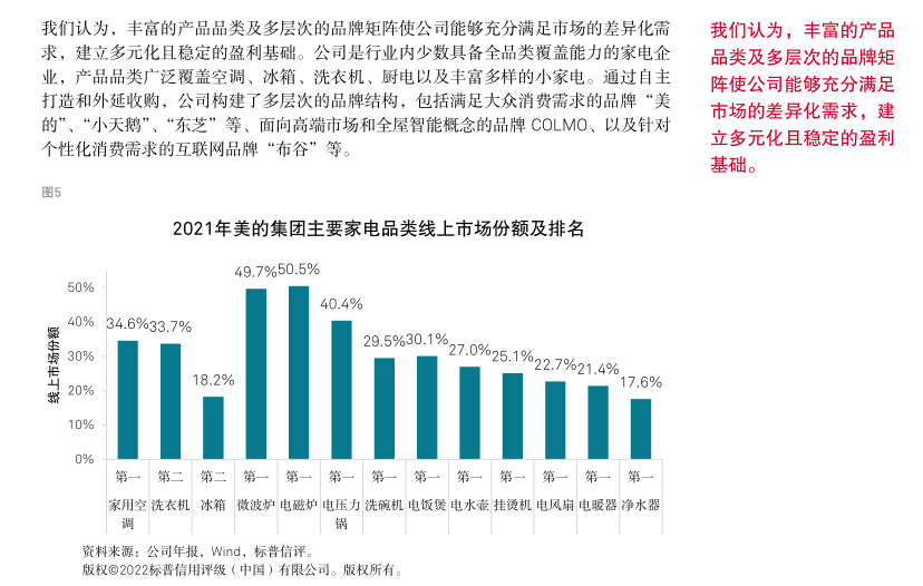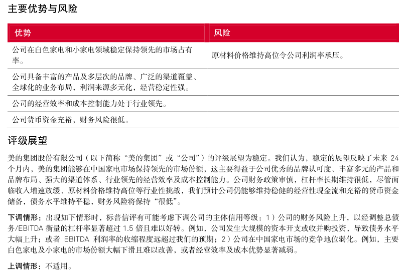 标普信评认为,美的集团“极佳”的业务状况反映了公司在中国家电市场优秀的品牌认可度、出色的供应链整合能力、强大的销售渠道,尤其是公司丰富多元的产品和品牌布局以及很强的经营效率和成本控制能力,使公司的竞争优势显著超越大部分同业。得益于上述优势,美的集团在中国家电市场长期保持领先的市场份额。此外,公司全球化的业务布局增强了收入和现金流的稳定性。但公司的海外业务模式仍以 OEM(“Original Equipment Manufacturer”)为主,自主品牌占比仍有一定提升空间。我们预计,上游原材料价格高位波动将令公司的利润率水平承压,但通过产品提价、成本控制等举措,公司能够部分缓解成本上涨的压力。在中国市场,美的集团在家用空调、冰箱、洗衣机三大白色家电品类长期保持第一名或第二名的市场份额,在小家电市场保持第一名的市场份额。我们认为,对于耐用消费品行业,市场占有率是企业综合竞争实力的总体反映,领先的市场份额往往反映出企业在品牌、产品、渠道、效率等方面具备强于同业的竞争优势。
