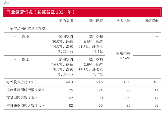 我们认为,所选取的同业企业均凭借其品牌影响力在各自的优势领域建立了一定的市场份额,在家电行业的各个细分领域形成交叉竞争。其中,美的集团、海尔智家、格力电器是中国家电行业的龙头企业,3 家企业的综合实力均很强,竞争优势各具特色。美的集团在白色家电及小家电市场稳定保持第一或第二的市场份额。海尔智家在白色家电领域也保持领先的市场份额,其中冰箱、洗衣机品类的竞争力很强。格力电器在空调品类长期保持领先的市场份额。
