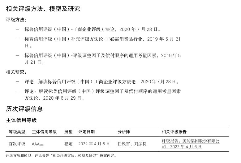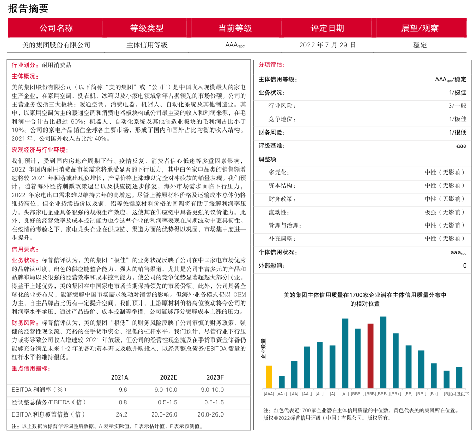 截至 2021 年末,美的集团由美的控股有限公司(“美的控股”)直接持股 31.05%,实际控制人何享健持有美的控股94.55%的股权,并直接持有美的集团0.46%的股权。美的控股的业务和财务与美的集团高度重合,对美的集团的信用质量无负面影响。综上所述,我们评定美的集团的主体信用等级为 AAA spc 。