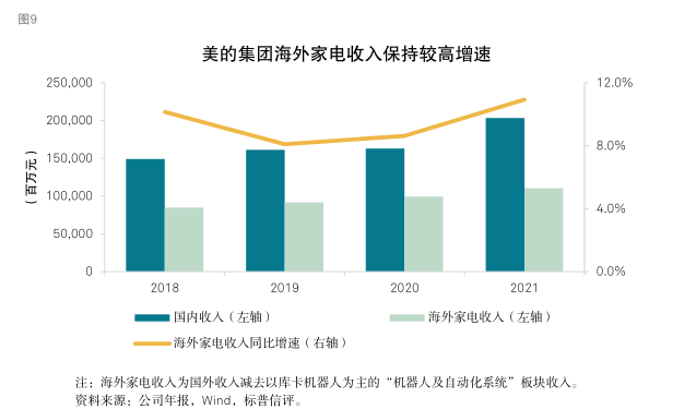 我们认为,对核心零部件生产和研发的深度整合使得公司具备引领产品更新换代的能力,有利于长期维持领先的产品竞争力,另一方面也增强了核心零部件供应链的稳定性。通过向上游整合家电核心零部件的生产和研发,公司建立了二线竞争对手很难超越的供应链壁垒。美的集团具备自主生产、研发空调核心零部件压缩机的实力。2021年,公司生产的家用空调压缩机在全球市场的占有率超过 40%,稳居全球第一。空调压缩机具备一定技术门槛,对规模化生产的要求高,在现有的市场格局下,二线竞争者较难向上游整合,挑战公司的占有率。