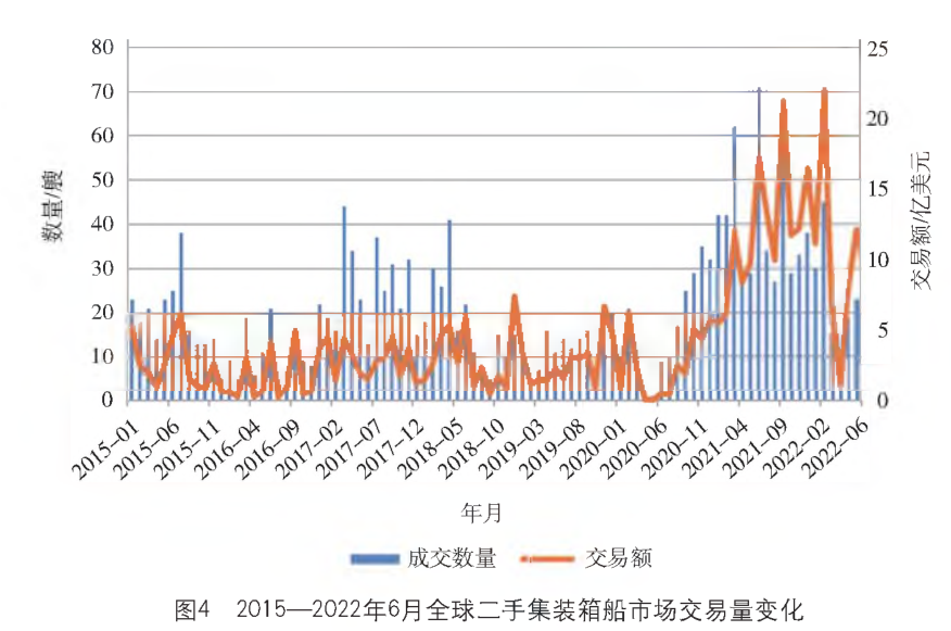 易量 暴 增 , 成交量迎来近年来巅峰 , 这是因为运价走高集装箱需求紧张 , 部分船东来不及订造新船就通过购买二手船抢抓市场机遇 。 但随着去年新船订单不断增加 , 二手集装箱船交易量也将回归正常区间 , 同时考虑到环 保 要求越来越严格 , 大部分二手船不具 备 双燃料技术 , 二手集装箱船市场恐难以再度迎来热潮 。 2015 — 2022 年 6 月全球二手集装箱船市场交易量如图 4 所示