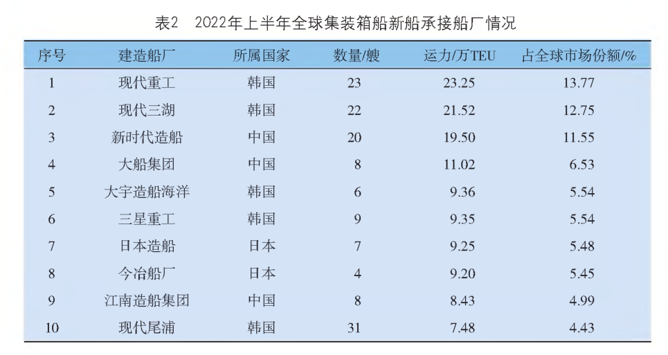 受宏观因素影响 , 2022 年上半年全球集装箱船市场延续去年较好的行情 , 但整体逐步回稳 , 集装箱海运贸易增速略有减缓 , 全球集装箱新船成交量较去年有所收缩 。 未来集装箱船新造船市场需求可能出现回落 , 但主要集装箱船船东盈利状况较好 , 仍有部分船东亟待实现运力升级和扩张 , 持续投资订造新船 , 订单结构也将趋向多元化。