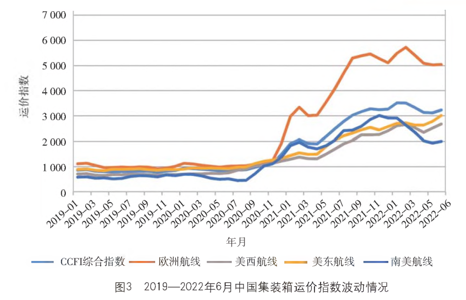 2022 年上 半 年 , CCFI ( 中国集装箱运价指数 )平均值为 3 304 点 , 6 月值较年初高点下降 8%o 主要航线如欧洲航线 、 美西航线 、 美东航线以及南美航线的运价指数平均值分别为 5 300 、 2 558 、 2 747 和2 312 , 较年初分别下降 8. 1% 、 增长 2.5% 、 增长11.6% 、 下降 31.3% 。 2019 — 2022 年 6 月中国集装箱运价指数波动情况如图 3 所示 。受全球集装箱海运市场影响 , 2022 年上 半 年 ,全球集装箱船二手船交易呈波动下行走势 , 共交易136 艘 、 648.8 万 TEU 、 60.8 亿美元 , 成交金额为去年全年的 42.3% 。 2021 年 , 集装箱船市场二手船交