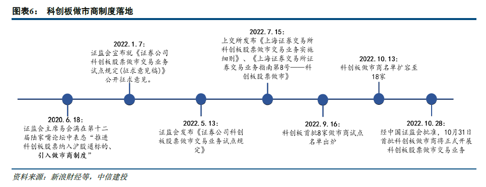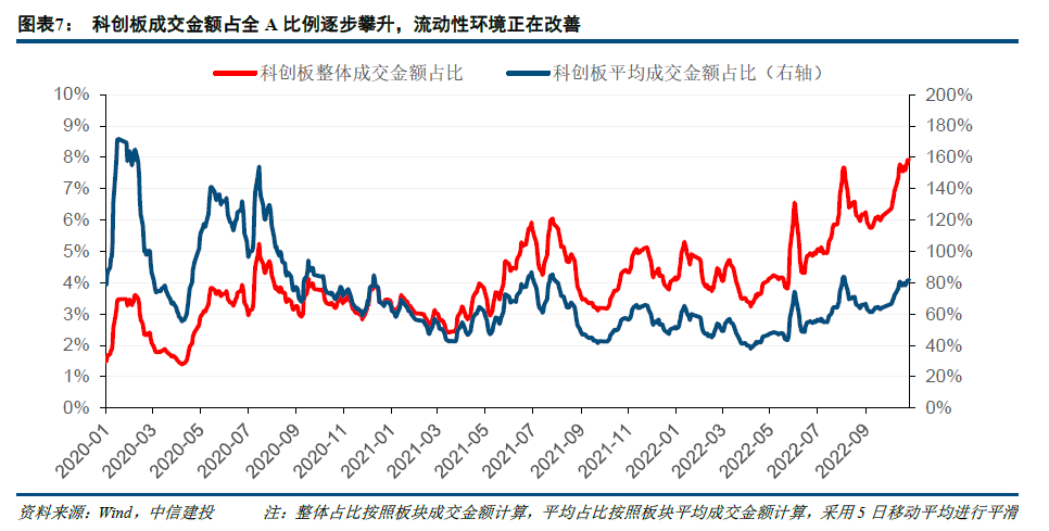 “做市商”制度引入,基础制度不断完善,交易活跃度有望提升。2022年1月7日,证监会就在科创板试点做市商制度公开征求意见;5月13日,证监会发布《证券公司科创板股票做市交易业务试点规定》,明确包括做市商准入条件与程序、内部管控等多方面内容;7月15日,上交所发布《上海证券交易所科创板股票做市交易业务实施细则》和《上海证券交易所证券交易业务指南第8号——科创板股票做市》,对科创板做市商业务做出了更加具体的监管规定和细则。10月31日,科创板股票做市交易业务正式启动。从理论层面和海外资本市场有关经验来看,做市商制度的推出,将进一步提升科创板市场的流动性,避免流动性欠缺导致部分标的价格过度波动,吸引更多投资者参与到科创板标的的投资中来,从而更好地完善科创板市场的价格发现功能。此外,二级市场流动性改善一定程度上也会对一级市场起到正向反馈作用,进而提高科创板市场资源配置效率,更好地服务于“创新驱动发展”战略。